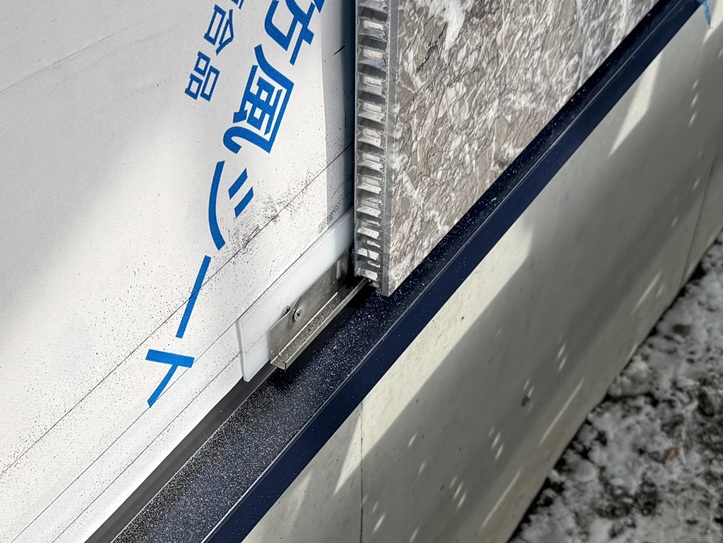 天然石とハニカムとの複合板「ライトストーンパネル・オーラ」で従来の建築石材の約1/4以上の軽量化を図り、機械的に躯体と固定することで接着不良による剥離・落下を防ぎ、安全性の高い施工を実現します。 背面に通気層を確保し水気の滞留防止とエフロ抑制を同時に実現。天然石ならではの圧倒的な高級感と重厚感をもたらします。