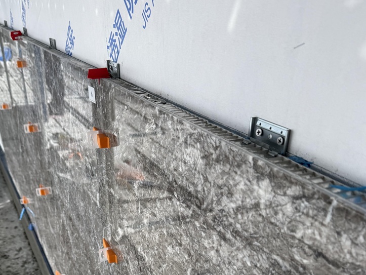 既存壁を解体することなく大判の石材を確実に固定できるため、改修工事において高い施工性と信頼性を発揮します。